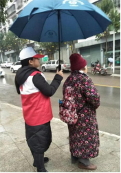 图表 1志愿者为陈奶奶撑伞准备一同前往社区