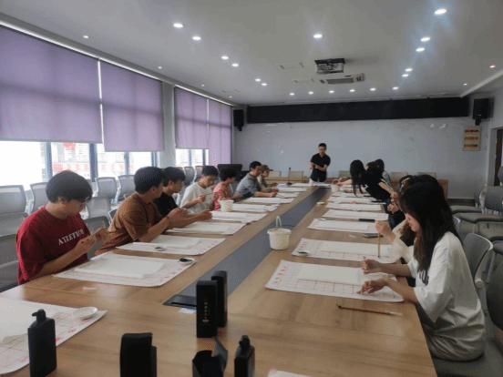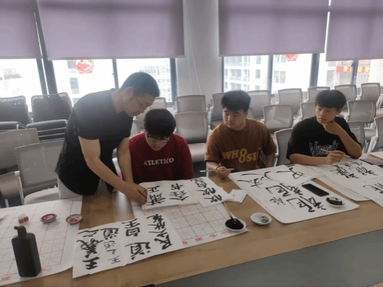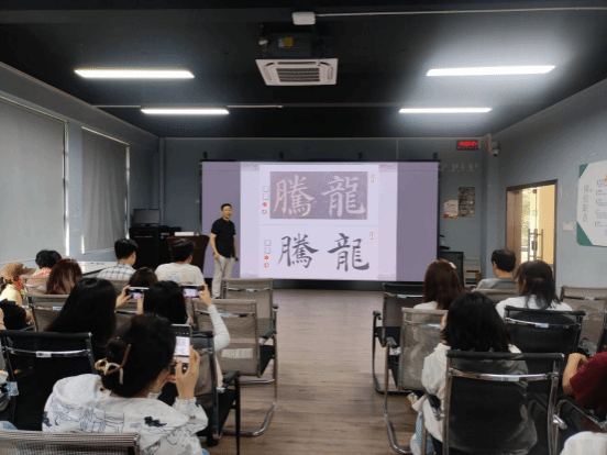 在书写实践体验环节,范老师结合王羲之、颜真卿、褚遂良、欧阳询等古代书法大家的集字作品,详细介绍“龙腾”、“求实”等书法作品的书写要点,他亲自示范了纸张叠格、落款盖印等书法技艺,让师生们在实践中体验中国书法的精妙与美感。