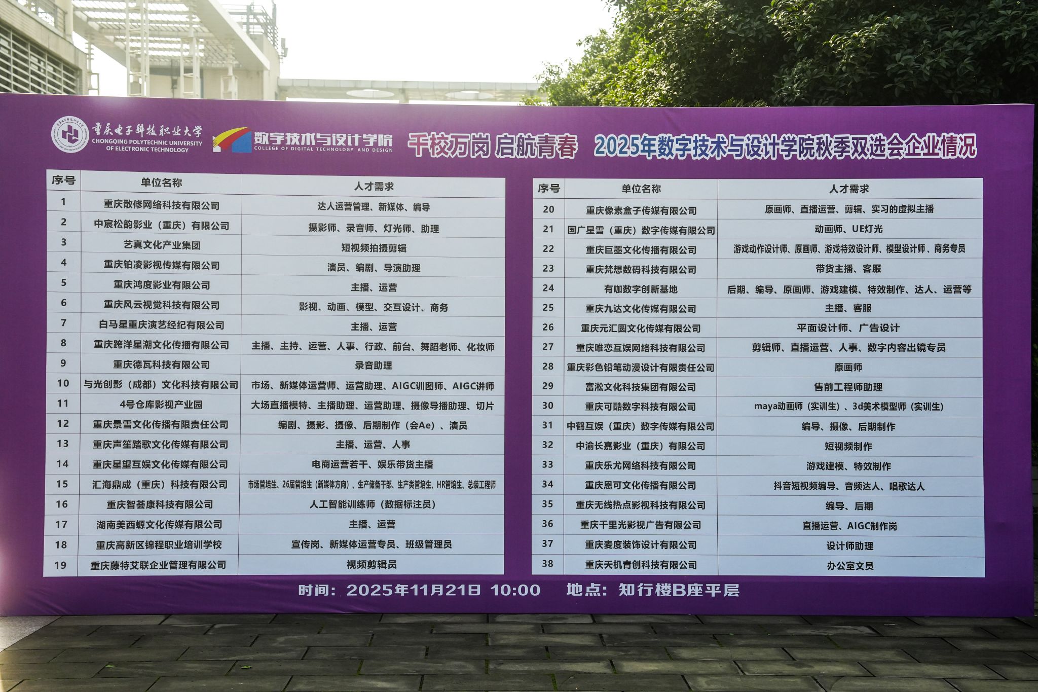为精准助力2026届毕业生逐梦青春,搭建毕业生与优质企业双向奔赴的坚实平台,数字技术与设计学院于11月21日上午10点在知行楼B座平层隆重举行“千校万岗·启航青春”2026届毕业生专场双选会。本次双选会汇聚市内外41余家优质企业,吸引超千名毕业生怀揣梦想、踊跃参与。