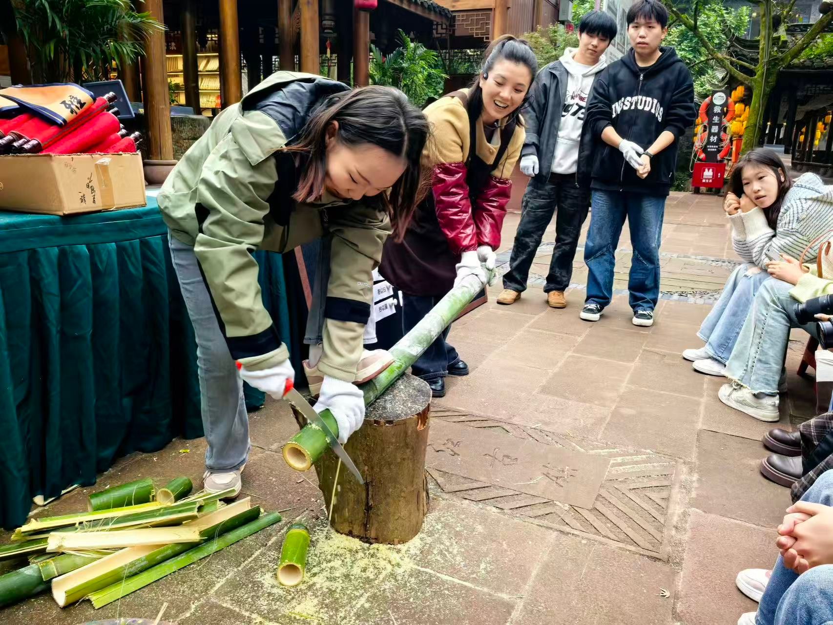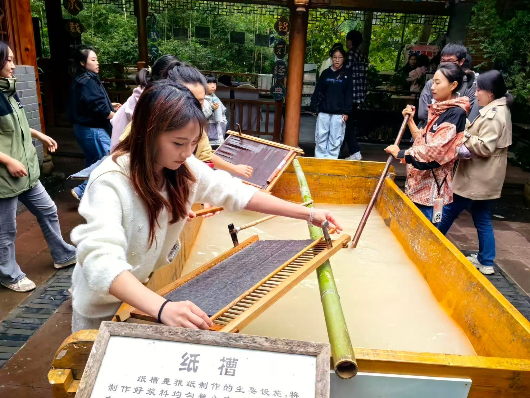 在古镇古法造纸工坊里,工作人员严谨且系统地对造纸工艺的每一道工序进行了讲解。参与活动的同学们严格依照讲解流程,自“斩竹漂塘”这一工序起,规范且认真地完成锯竹、剥皮、浸泡等基础操作,真切感受竹纤维于水中舒展时呈现出的纹理;在“煮徨足火”环节,深刻体悟时间沉淀所蕴含的意义;于“荡料入帘”实操中,精准把握力道与耐心之间的科学平衡;最终在“覆帘压纸”工序里,成功完成一张纸的制作。同学们深切体会到传统造纸工艺的精妙之处,将“慢工出细活”的工匠精神切实转化为可感知、可量化的工艺标准,充分彰显了传统文化的传承价值。